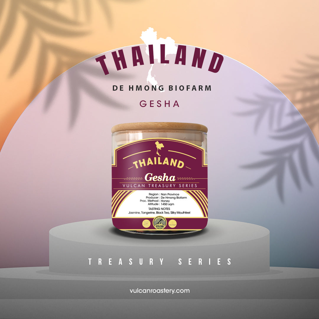 From the mountains of northern Thailand, this Treasury release features a honey-processed Gesha lot, cultivated by Wichai Kamnerdmongkon at Coffee De Hmong Bio Farm, a farm that has previously won Cup of Excellence awards. Known for meticulous care and a dedication to sustainability, Wichai’s work has elevated his region within the global specialty coffee scene, combining centuries-old farming wisdom with modern regenerative practices.